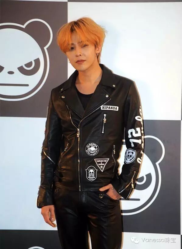 上海,G-DRAGON权志龙出席代言活动。他佩戴的耳环与身穿的Hi Panda黑色贴布机车皮衣,很有街头感。