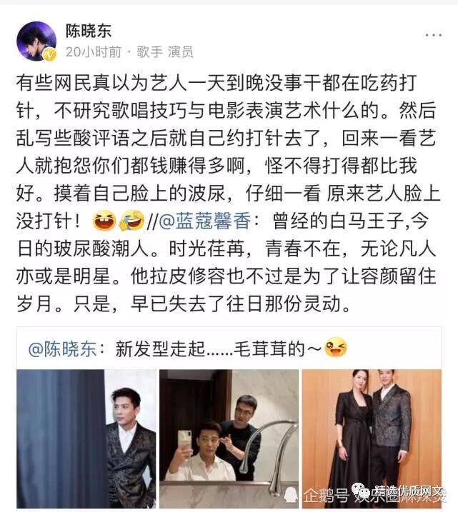 但是,陈晓东这刚刚晒完自己的美照,果不其然就有网友直接怼他:曾经的白马王子,今日的玻尿酸潮人,时光荏苒,青春不在,无论凡人亦或是明星,他拉皮修容也不过是为了容颜留住岁月。只是,早已失去了往日的那份灵动。该网友的留言可以说是“句句扎心”,陈晓东直接下场怼网友:有些网民真以为艺人一天到晚没事干都在吃药打针,不研究唱歌技巧与电影表演艺术什么的,然后乱写些酸评语之后就自己约打针去了,回来一看艺人抱怨你们都钱赚得多啊,怪不得打得都比我好,摸着自己脸上的波尿,仔细一看,原来艺人脸上没打针,陈晓东也怼得算有水平了,既回击了酸他的网友,同时又说明自己并没有打针,但是看着感觉“心酸”!