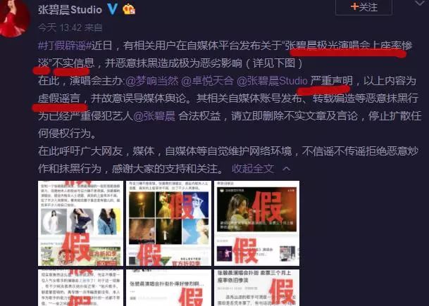 张碧晨工作室直接在微博上晒出了很多的文章,这些文章也都是关于张碧晨演唱会上座率低的负面新闻,张碧晨工作室矛头直指这些文章,声明这些文章是假消息。