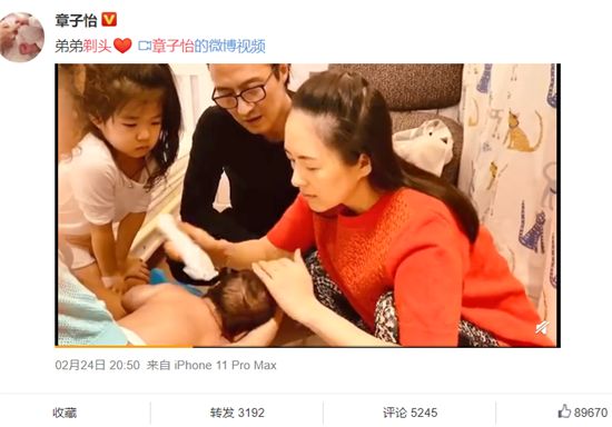 章子怡的儿子是一月一号出生的,到2月24号才50多天,这么点大的孩子,虽然时下的理发器都很安全,一般人还是很下得去手。章子怡却在网上晒了一段给儿子剃头的视频:章子怡的手法可以说很娴熟,汪峰和女儿父女俩负责围观却是满脸的好奇和紧张。有人直接形容章子怡手法娴熟到“像是在削土豆”:确实是,不知道章子怡是不是不止一次给儿子剃头,这么娴熟的手法不像是第一次。
