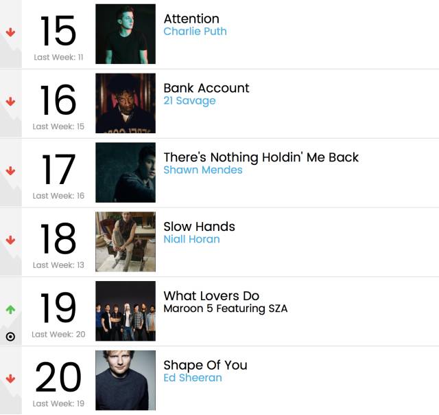 有两首歌首次进入前四十,Camila Cabello的《Havana》从第四十四上升至第二十九;Post Malone的《I Fall Apart》由第六十五名上升至第三十九名。