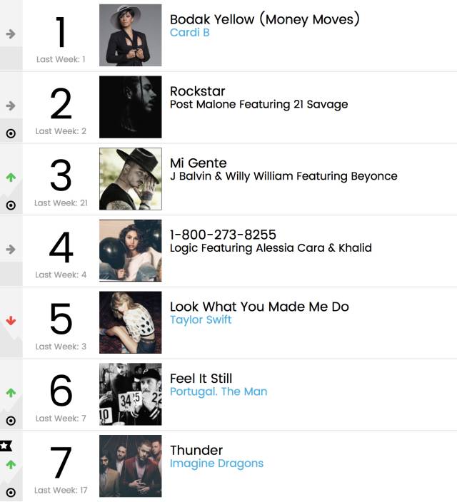新单《Mi Gente》火速从第21名上升至第3名。Cardi B的《Bodak Yellow》连冠三周。Imagine Dragons的单曲《Thunder》重回前十,Demi Lovato拿下职业新高排名