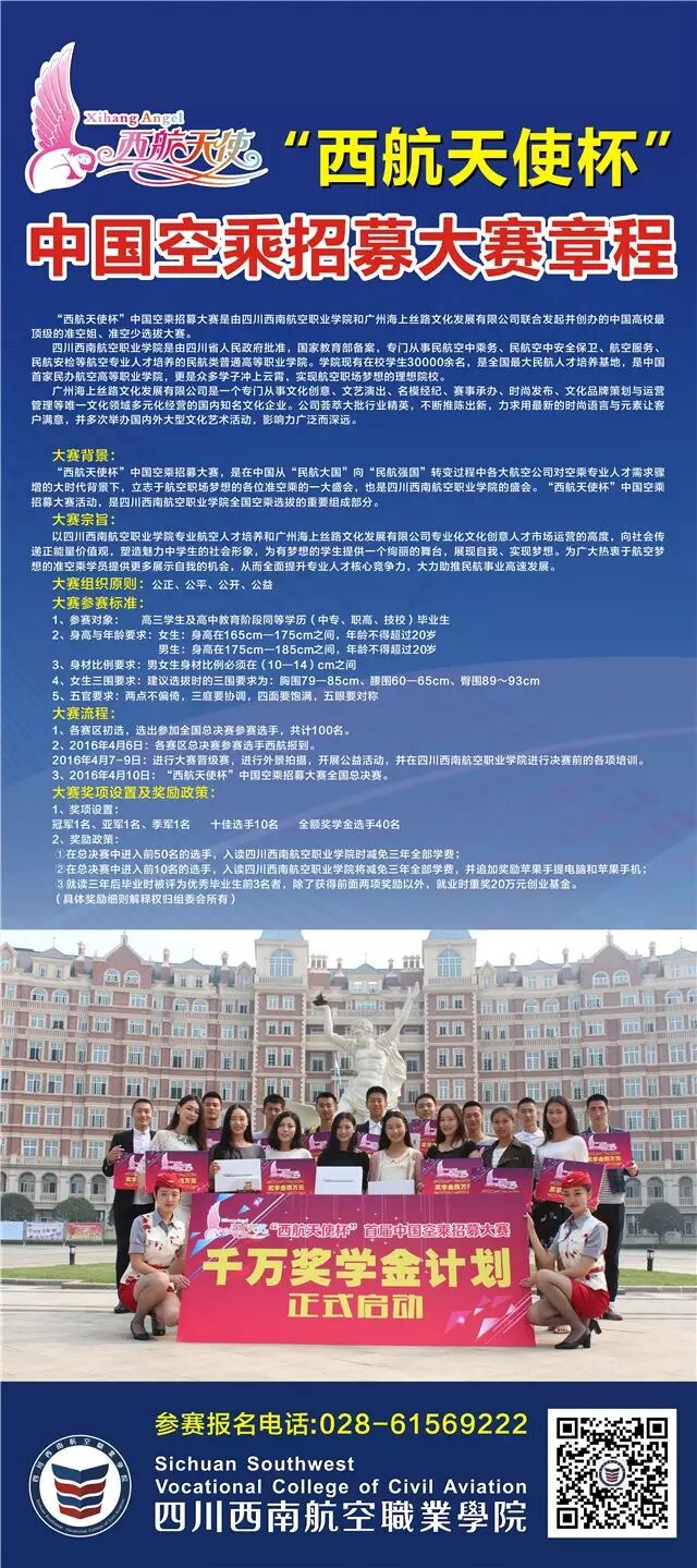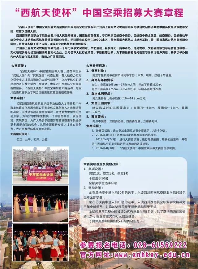 王艳老师 在西航西航千万奖学金第二季正式启动,免学费读... 西航助考 内地女星 2016-03-11 21:39:18 447 创作不易,用心坚持,欢迎请BaGua喝几杯爱心咖啡!打赏并支持本文 打赏并删除本文 展现青春风采寻找蓝天最美天使赵蕊婷"西航天使杯"首届中国空乘招募大赛十佳选手、四川西南航空专修学院空中乘务专业、南方航空公司准空姐看到赵蕊婷,你会被她真诚的微笑所温暖。2015年5月8日,赵蕊婷成功晋级“西航天使杯”首届中国空乘招募大赛前十强,并获得了西航五万余元新生奖学金和苹果三件套奖品,她开始在西航追逐自己的蓝天梦。“我是一个活泼,开朗有上进心的女孩,我喜欢微笑对待身边所有的事情“,生活中的赵蕊婷总是带着向日葵一般的微笑。在西航,赵蕊婷也在专业学习中培养出坚强、有毅力的性格。对于赵蕊婷来说,比赛的过程都还历历在目,”每一次经历都是生活给予的宝贵经验,是成长的必然。在参赛的过程中,我发现了自己的不足,借鉴到了他人的经验”,我要感谢西航给予我的这次机会,另外我还要感谢我的家人、老师、朋友一路以来给我的支持。时光飞逝,转眼在西航已经一年,从一个普通的高中生变成了一个高要求严格自己的准空姐,赵蕊婷感触颇多。“我很喜欢学校举办的各种有趣的活动:令人震撼的军训汇报、high爆全场的校园歌手大赛、恐怖而开心的万圣节、温馨浪漫的圣诞晚会.... 这些丰富多彩的校园活动给了我们很多的展示机会”。在西航这个大家庭,军事化标准化管理是与普通大学最大的不同,每天跑操提升身体素质、每天吃饭要遵守秩序、每天需化妆整理好职业形象等,“西航就是一所整容所,它塑造了你的涵养、提升了你的气质”。我热爱空中乘务这个专业,在西航的学习的这些日子里,我越来越了解这个专业的价值所在更让我明确了我的目标:成为一名优雅空姐,翱翔蓝天!我会努力去实现自身价值,竭尽全力让我的梦想插上一双翅膀!“ 我要带着梦想的翅膀,飞向远方,跨越那大海高山白云蓝天,去到更广袤的神秘世界~西航天使杯第二届中国空乘招募大赛等你来战“西航天使杯”中国空乘招募大赛是由四川西南航空职业学院和广州海上丝路文化发展有限公司联合发起并创办的中国高校最顶级的准空姐、准空少选拔大赛。其站在四川西南航空职业学院专业航空人才培养的高度,向社会传递正能量价值观,塑造魅力中学生的社会形象,为有梦想的学生提供一个绚丽的舞台,展现自我、实现梦想。“西航天使杯”第二届中国空乘招募大赛章程拓展阅读媒体聚焦 | 中国首届空乘招募大赛成都举行媒体聚焦 | 中国首届空乘大赛落幕 “头条校长”送千万奖学金素材来源:西航招生处四川西南航空职业学院专业面试主考王艳老师:15228473198QQ交流:364095948学院网址:http://www.xnhkxy.edu.cn/微信号:xhzk15228473198 创作不易,用心坚持,欢迎请BaGua喝几杯爱心咖啡!打赏并支持本文 打赏并删除本文 感谢您的支持鼓励,我会继续努力的!文章地址:用户邮箱:打赏金额:USDT 请输入数字点击”去打赏“,即可进行打赏支持本文章哦 About the Author 西航助考 功能介绍:交流平台 Related Posts 王艳老师 在西航 选择西航的N个理由!(附视频) 2016-12-31 19:26:36 王艳老师 升学•帮 平行志愿、顺序志愿、征集志愿,应该... 2016-05-09 17:50:31 王艳老师 在西航 云非印象 · 访四川西南航空职业学院魏... 2016-05-09 17:50:31 王艳老师 资讯 民航机务工资构成讲解 2016-05-09 17:50:31 王艳老师 实用|空姐教你坐飞机如何吃饱吃好 2016-03-16 17:34:29 发表评论