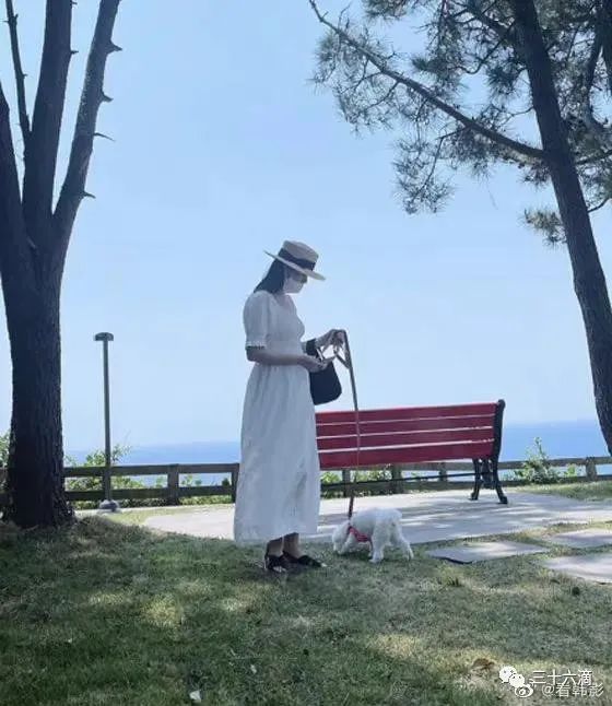 还有一张站起来的图,她牵着自己的小狗狗惬意散步。