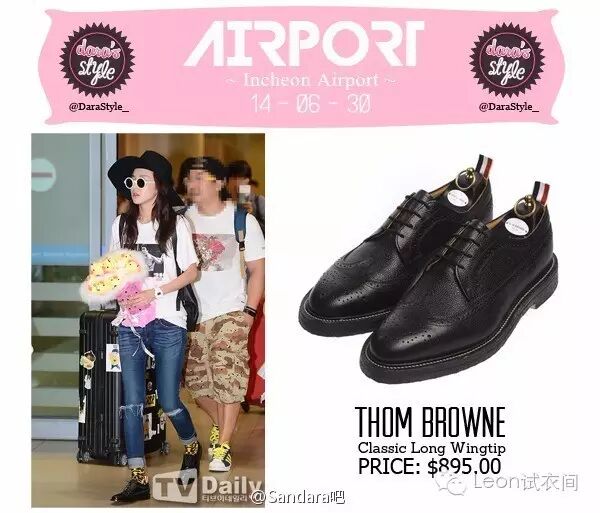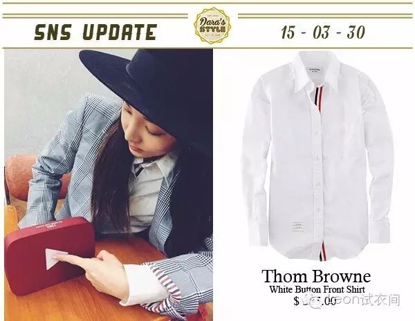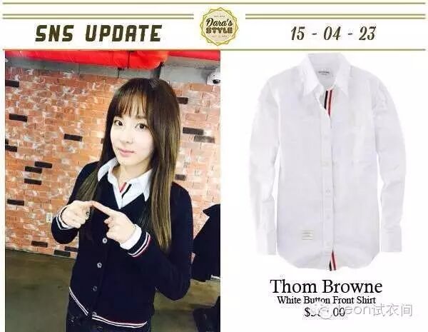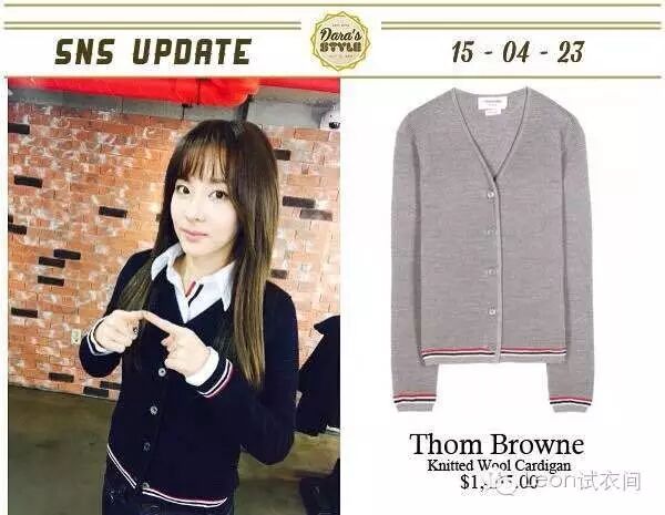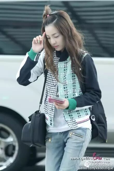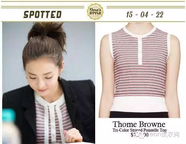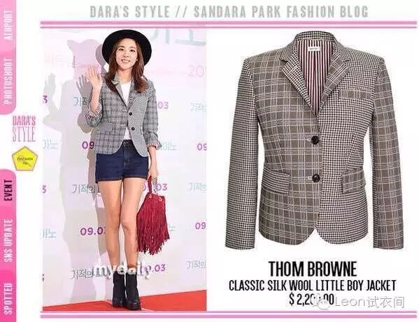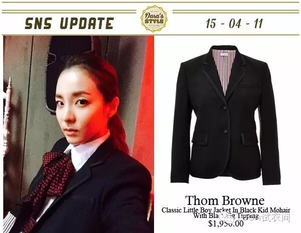 也许是受Big Bang影响,thom browne逐渐蔓延到整个YG家族,2NE1的Sandara Park也是TB的深度中毒者。和允儿仙女的路线不同,Dara身形瘦巧脸很少女,却极其喜欢男票风的中性混搭,日常穿搭多以裤装、运动鞋的街头风格为主,非常俏皮搞怪。
