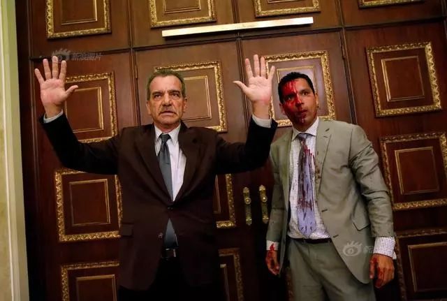 18/40 当地时间2017年7月5日,委内瑞拉加拉加斯,政府支持者在反对派控制的议会举行会议期间突然闯入,反对党议员Luis Stefanelli将双手举起。Carlos Garcia Rawlins/Reuters/Newscom