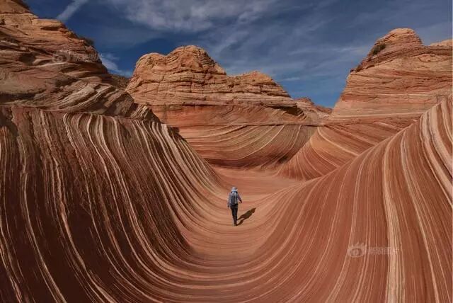 32/40 当地时间2017年10月30日,一名背包客行走在美国亚利桑那州的一处U型山谷,当地的地理条件形成了这种特殊地貌。