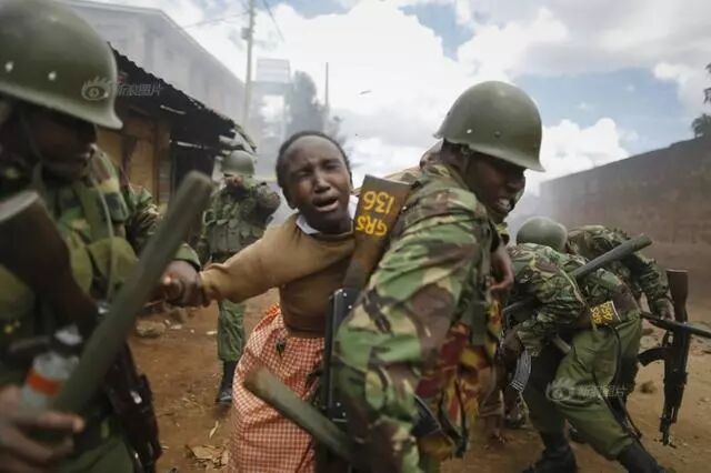 35/40 当地时间2017年10月30日 ,一名警察背着一名女学生,让她远离肯尼亚内罗毕警方和抗议者之间的冲突。Dai Kurokawa/EPA