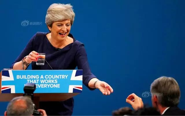 36/40 当地时间2017年10月4日,英国财长菲利普·哈蒙德向总理特里萨·梅递止咳药片。当时她正在英国曼彻斯特的保守党大会上发表演说。Phil Noble/Reuters/Newscom