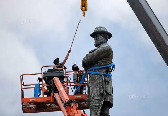 17/40 当地时间2017年5月19日,美国新奥尔良的工人准备拆除南北战争期间联盟国总司令Robert E.Lee的雕像。Gerald Herbert/AP
