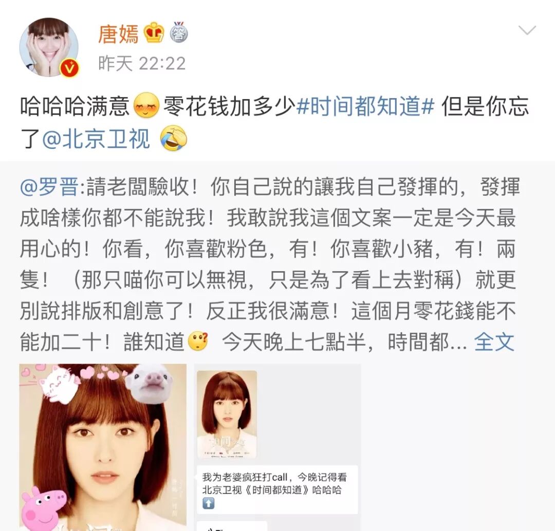 先是晒唐嫣给自己规定的文案,然后自己努力发挥了一番,