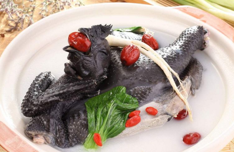 乌鸡性平、味甘;具有滋阴清热、补肝益肾、健脾止泻等作用。《本草纲目》认为乌骨鸡有补虚劳羸弱,制消渴,益产妇,治女性崩中带下及一些虚损诸病的功用。乌鸡内含丰富的黑色素,蛋白质,B族维生素等18种氨基酸和18种微量元素,其中烟酸、维生素E、磷、铁、钾、钠的含量均高于普通鸡肉,胆固醇和脂肪含量却很低。乌鸡的血清总蛋白和球蛋白质含量均明显高于普通鸡。