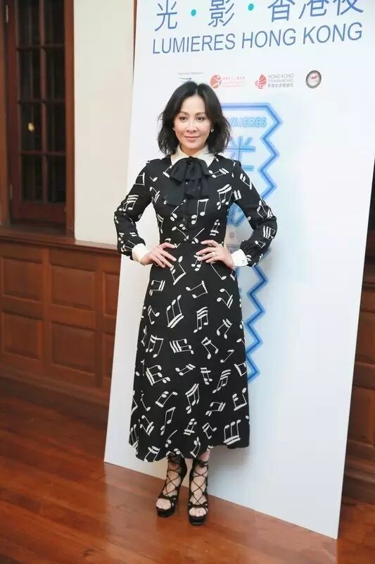 刘嘉玲身穿Saint Laurent 2016早秋系列黑色音符印花套装,系黑色蝴蝶结,脚踩黑色绑带厚水台高跟凉鞋。