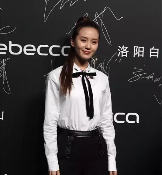 刘诗诗梳高马尾,身穿Vivetta白色衬衫,系黑色蝴蝶结,下穿GIVH SHYH黑色喇叭西裤。