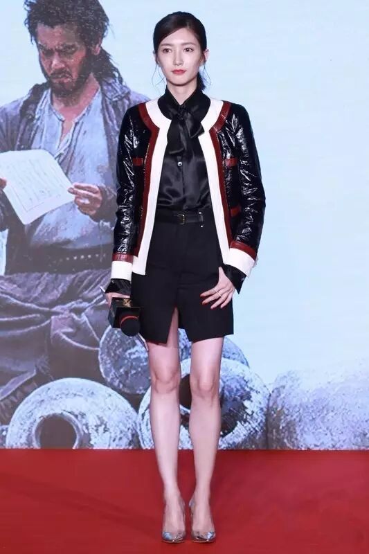 江疏影身穿黑色缎面蝴蝶结系带衬衫,外搭Chanel 2016“巴黎在罗马”高级手工坊系列拼色漆皮夹克,下搭黑色开叉短裙,系黑色皮质腰带,脚踩金属色尖头高跟鞋,佩戴Chanel J12-365黑色镶钻腕表。
