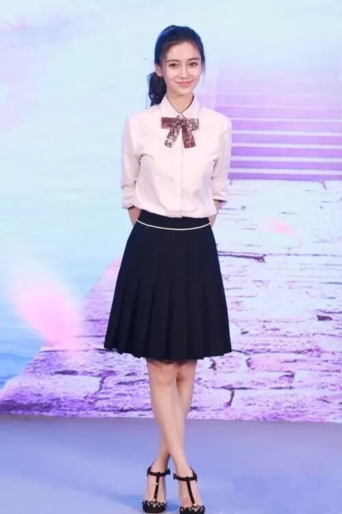 Angelababy白衬衣配百褶裙出席新电影发布会,像极了乖学生。