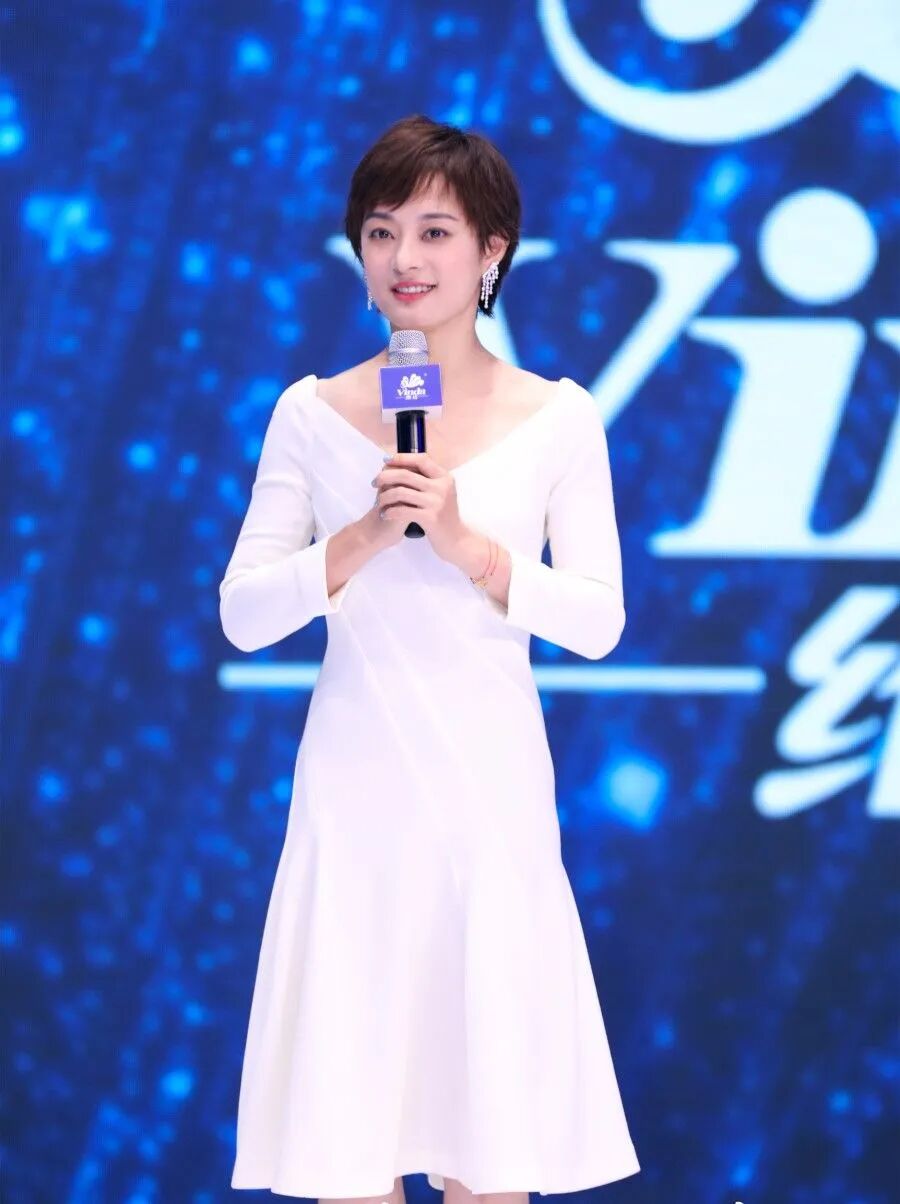 现在的她整体的模样就是不太一样,可能是她的额头比较宽,所以现在就会有一点刘海,这样的话就可以把自己的额头全部遮挡起来,也不会觉得有多么的突出。站在舞台上面,她身上穿的是一条白色的裙子,显得整个人确实会年轻好多岁。