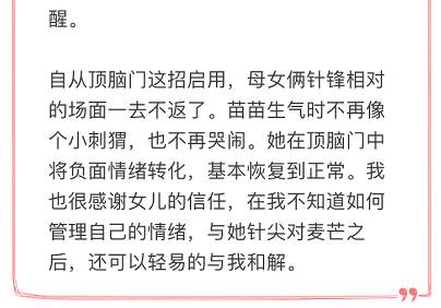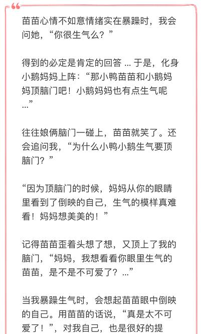 现在想来,大禹治水,疏通胜于阻挡。亲子大概也是这个道理。曾经居高临下用经验和阅历与孩子斗智斗勇,结果发现全然无用,还让母女关系越来越紧绷。如今游戏般地处理情绪,让负面的情绪只是停留在情绪表面,没有造成短期甚至长期的阴影和伤害。女儿爱笑了,我也松了口气。