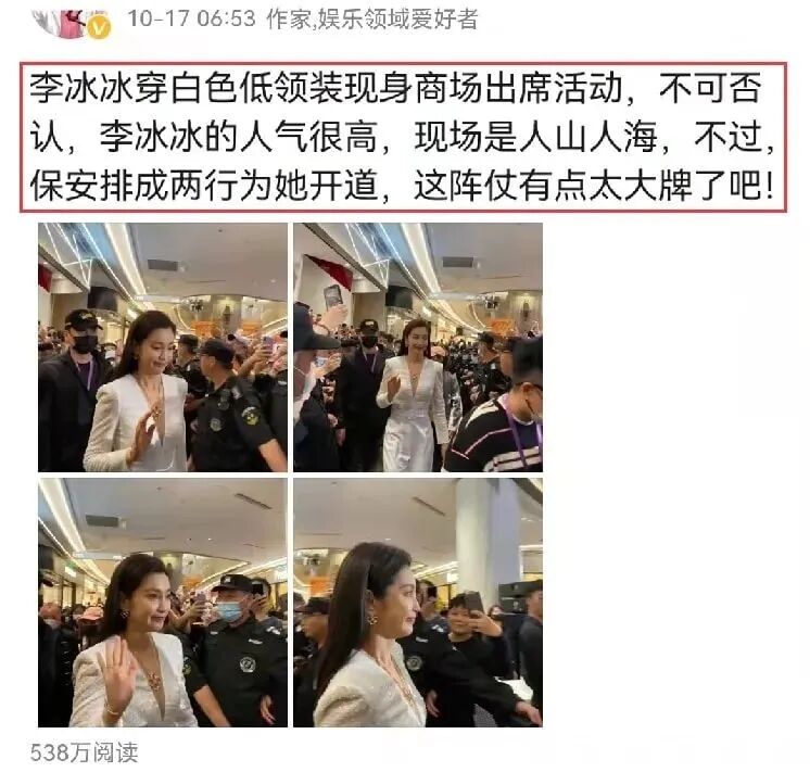 近日,有一位娱乐博主在网上晒出了一组李冰冰出席活动的照片,并配文“李冰冰穿白色低领装现身商场出席活动,不可否认,李冰冰的人气很高,现场是人山人海,不过,保安排场两行为她开道,这阵仗有点太大牌了吧”,李冰冰现身商场出席活动的照片火了,出席活动时阵仗太大,被指耍大牌。