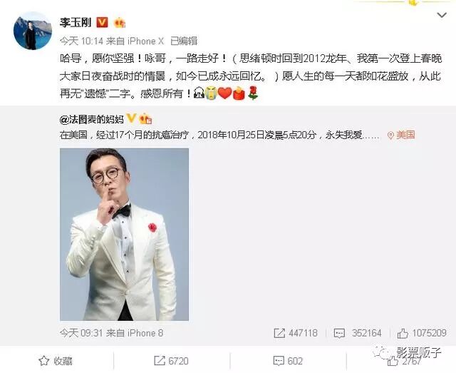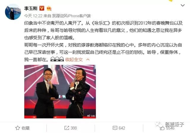 第一位是知名歌手李玉刚,在获悉李咏去世后,他连发两条微博悼念李咏,文中对李咏,以及哈文的知遇之恩感激不尽,称李咏夫妻俩让他“在异乡也感受到了家人般的温暖。”