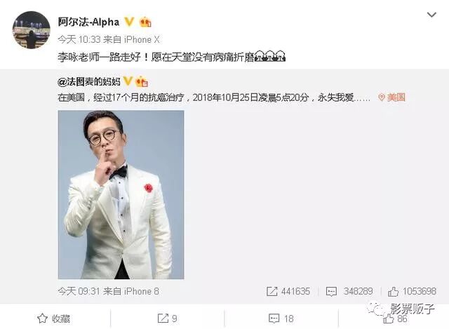 听闻李咏病逝后,阿尔法转发哈文的微博表示“李咏老师一路走好,愿在天堂没有病痛折磨。”