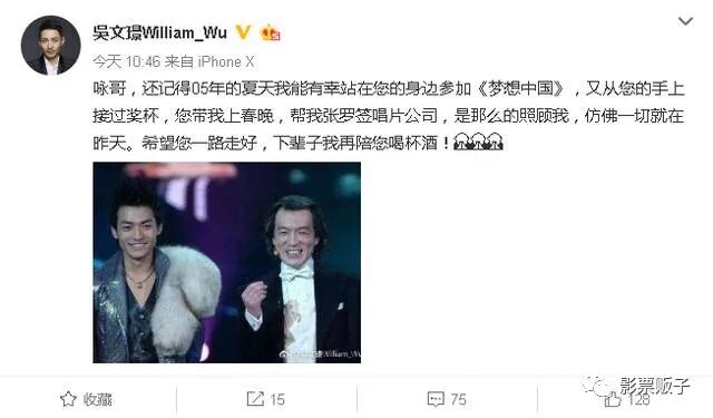 第四位视李咏如恩人的是05年《梦想中国》总冠军吴文璟,他在微博里称:“您带我上春晚,帮我张罗签唱片公司,是那么的照顾我,仿佛一切就在昨天。希望您一路走好,下辈子我再陪您喝杯酒”。