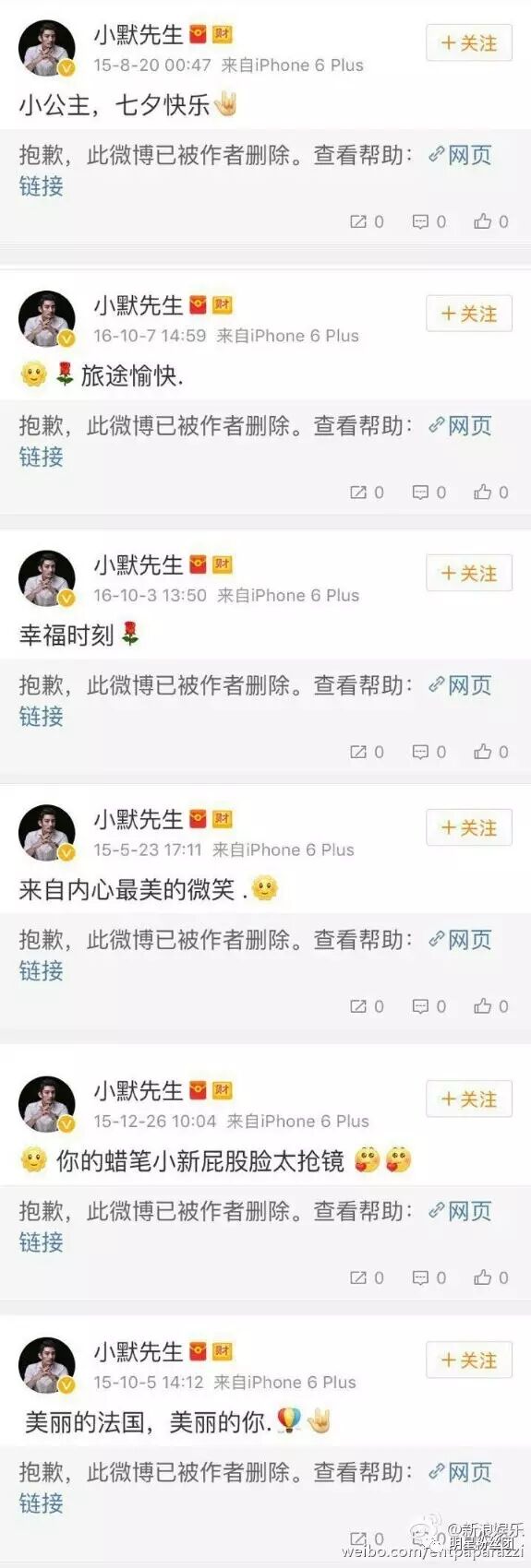 近日, 演员叶璇已经删光与男友的恩爱微博,疑是分手,而男方小默先生则保留爱的痕迹,疑留作念想,据传两人已经分手。