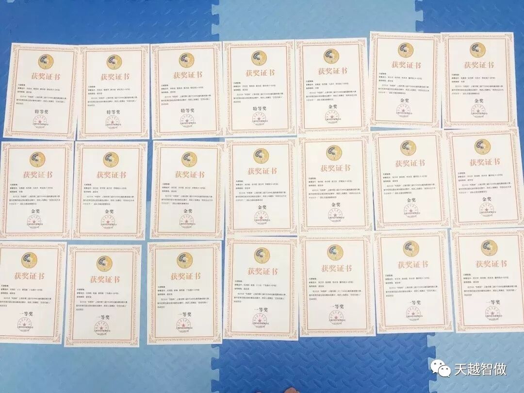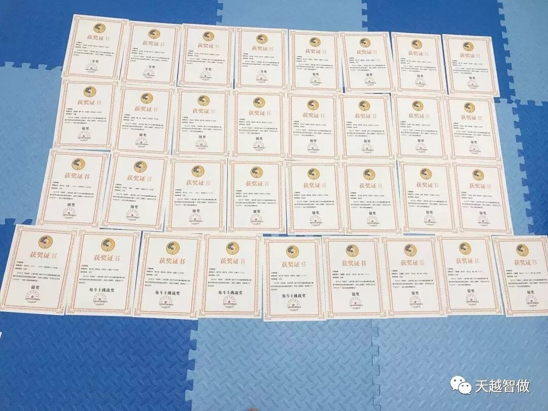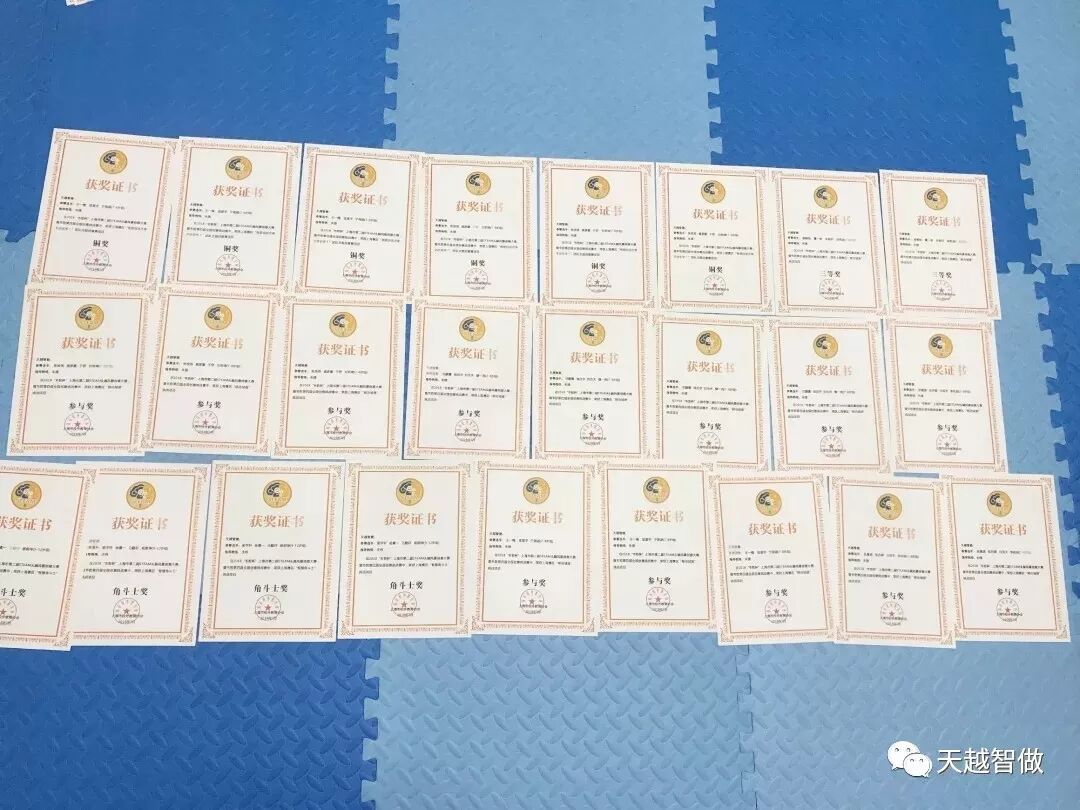 为了争取在比赛中取得优异成绩,中心成了比赛教研组,由6名老师针对赛题对学员专门指导。通过3个月的集训,天越智做在比赛中取得了优异的成绩:共有95人次获奖,挑战赛特等奖4名,一等奖12名,二等奖4名,三等奖4名,参与奖15名;创意赛金奖16名,银奖28名,铜奖12名。天越智做包揽学龄前组总分前4名中的3名,尤其是苏奕圣/管恩泽/薛沐辰/郭佑泽组以总分第一的佳绩获得特等奖,指导老师盛老师被组委会授予“金牌教练”的称号。