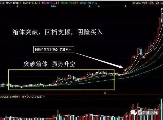 股市的价格在单个箱体内进行调整运行,在某天突破顶端,进而伴随着成交量的放量,散户切记不要追高,等待后期股价回调顶端时阴线买入,回调必是缩小成交量的;