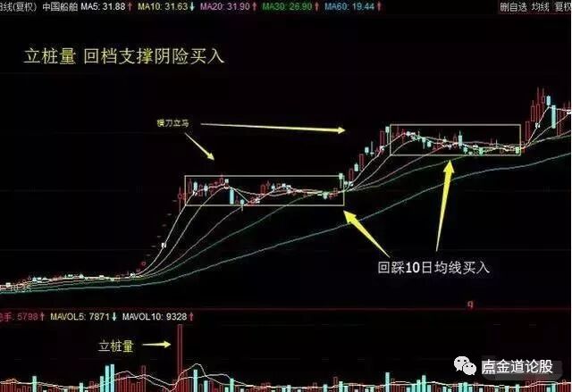 股市价格在上升行情中成交量突然放出巨量,进而股价开始拉升,到一定的点位开始盘整,回踩10日均线阴线买入,明后天,一般会再次突破