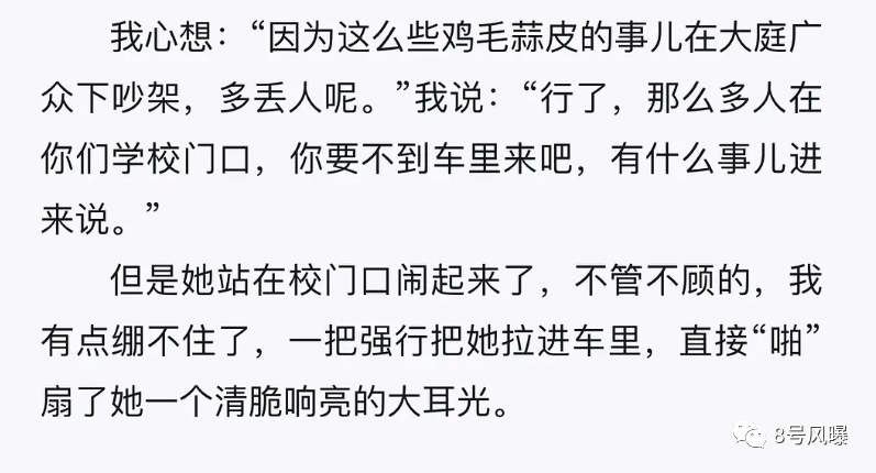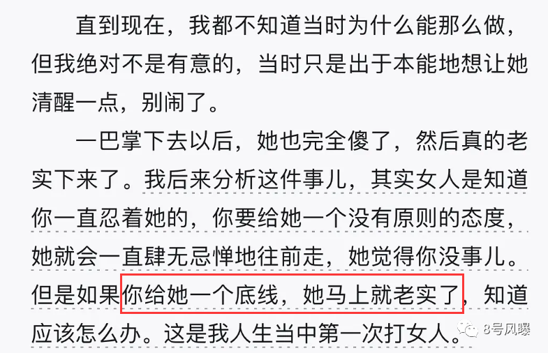 事后,还对自己忍不住上手打人,总结了经验之谈——如果你给她一个底线,她马上就老实了。