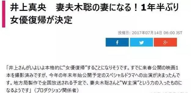 在7月初,报道又称“井上真央将正式以演员身份回归,并决定参演计划于今年年末播出的特别剧集。该剧集由地方电视台制作,面向全国播出,井上真央将与妻夫木聪搭档双主演。”