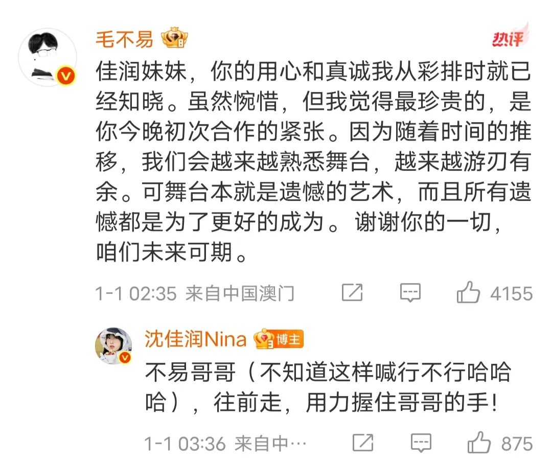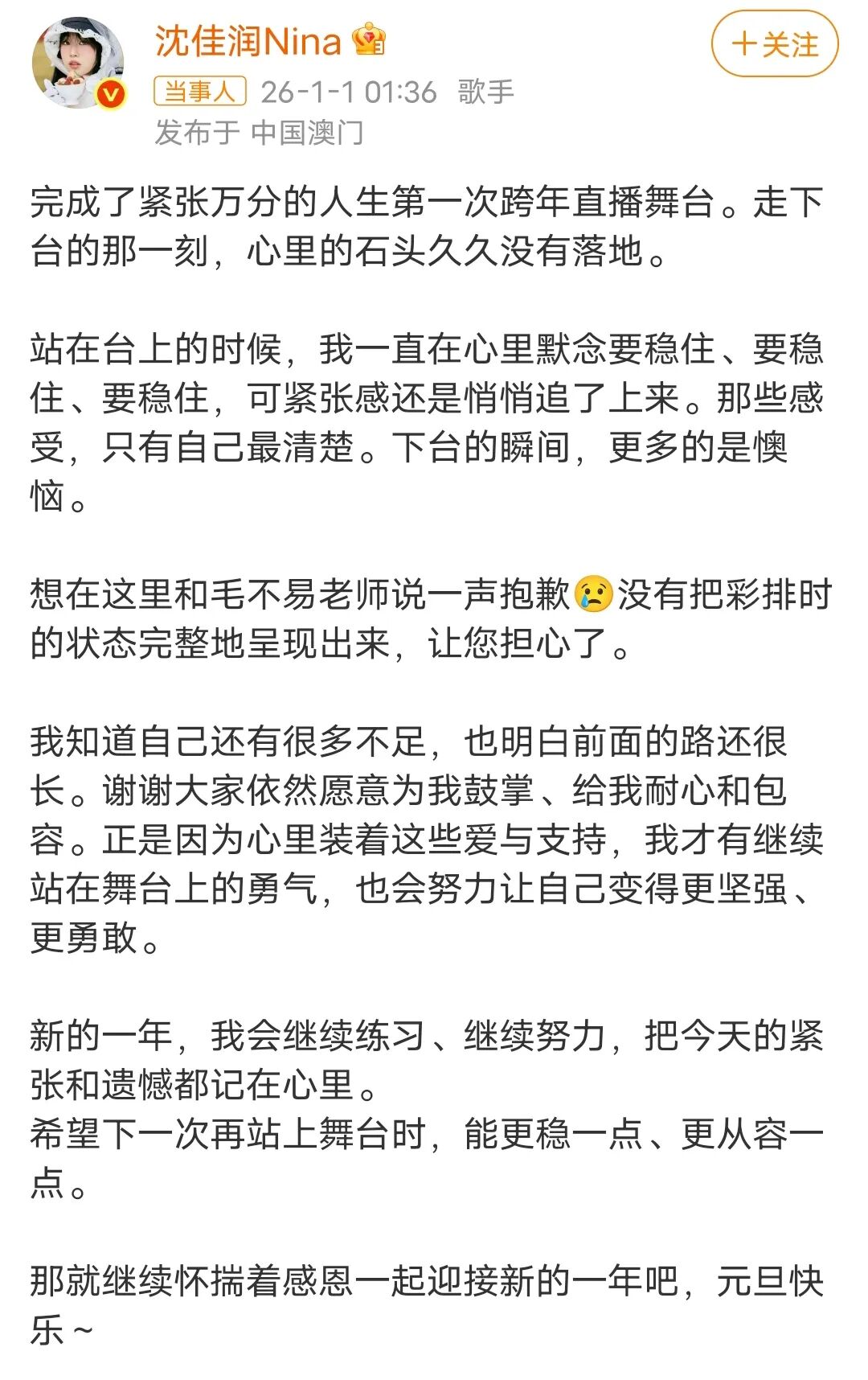 沈佳润次日(2026年1月1日)发文跟观众以及毛不易道歉,承认“未呈现彩排水准”,承诺未来“继续练习、更稳更从容”。