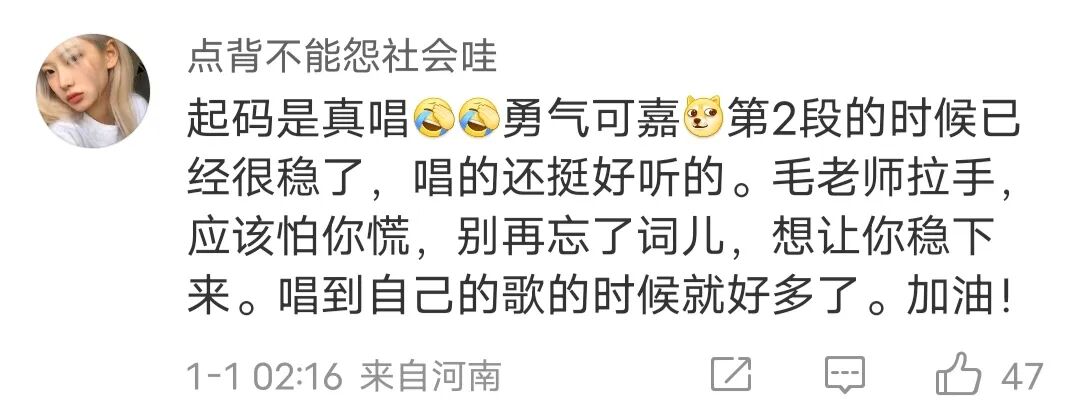 网友鼓励道:起码是真唱、勇气可嘉。第2段的时候已经很稳了,唱的还挺好听的。毛老师拉手,应该怕你慌,别再忘了词儿,想让你稳下来。唱到自己的歌的时候就好多了。加油!