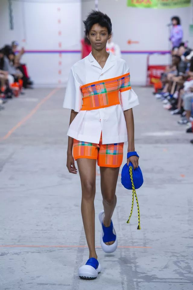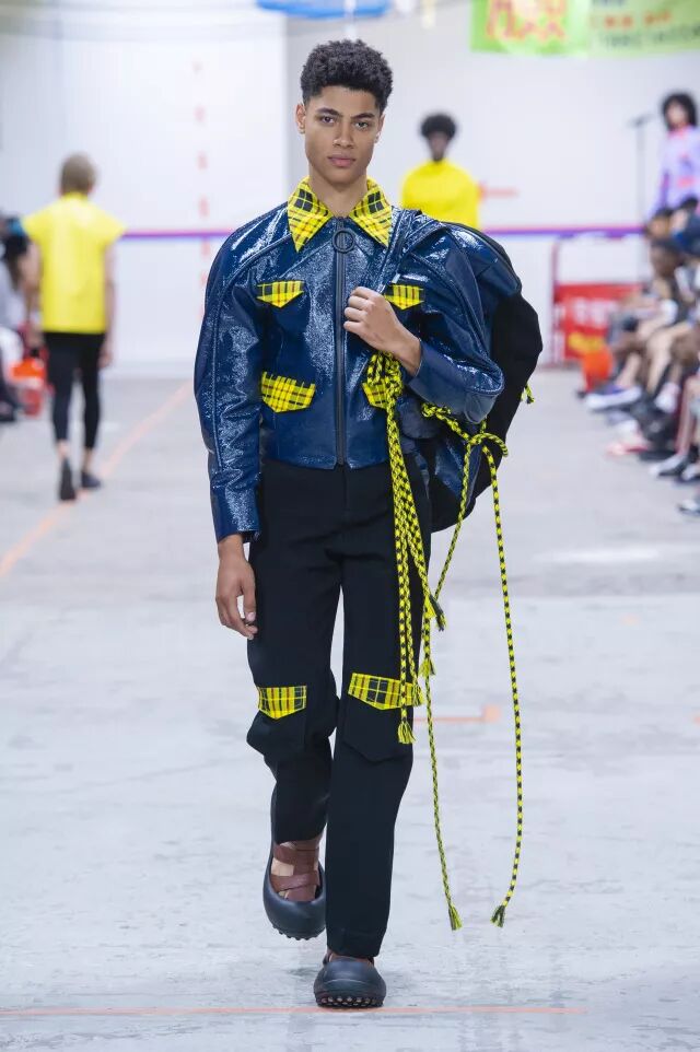 除了品牌常用的鲜艳色,设计师又使用松紧带、户外登山收绳的线条,以及局部露背、露肩来模糊性别,打破以往的传统和思维,凸显年轻幽默风格。