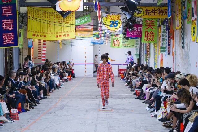 本季ANGUS CHIANG利用旧世代、性别、文化元素去重新拼贴我们的城市画面,试图理解城市中每个角色的故事。秀场中满是大大小小、五颜六色的广告牌、标签和符号,仿佛提醒着我们现实生活中的繁琐和一代代流传下来的信息与记忆。