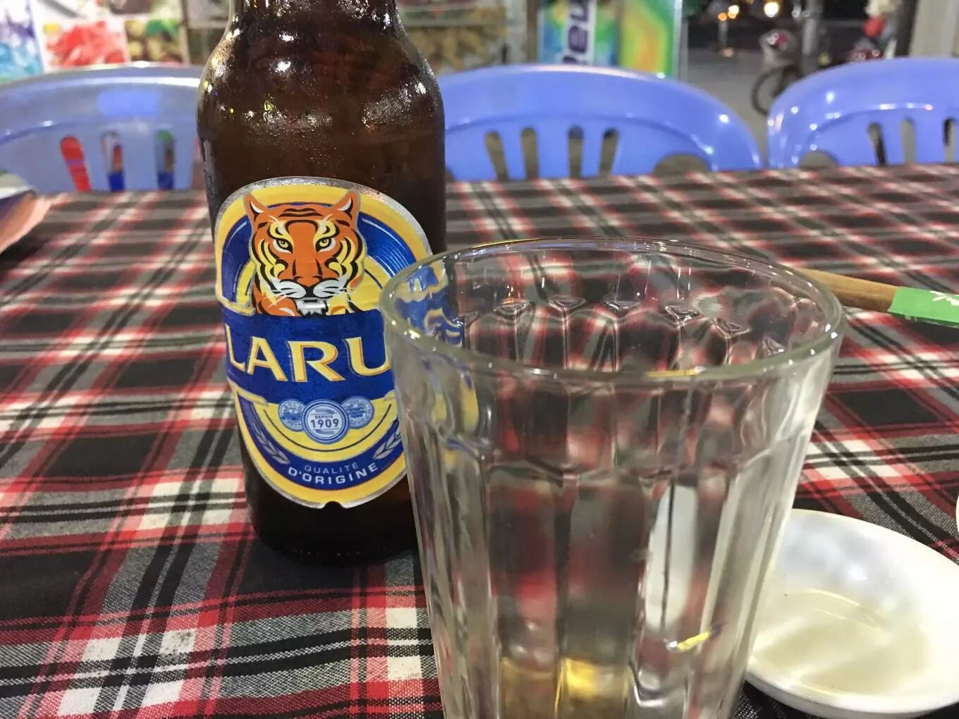 走走拍拍照之后到了晚上的时间,灯红酒绿,取摩托车去幸福姐2号。其实,并不知道点什么好也不知道攻略里说的是什么好吃,凭直觉点了一个壳类生物还有海鲜炒面,上菜才知道是炒方便面,略咸,不建议一个人吃。再点了一个越南有名的Larue啤酒,度数4.2%,喝的有些脸红。