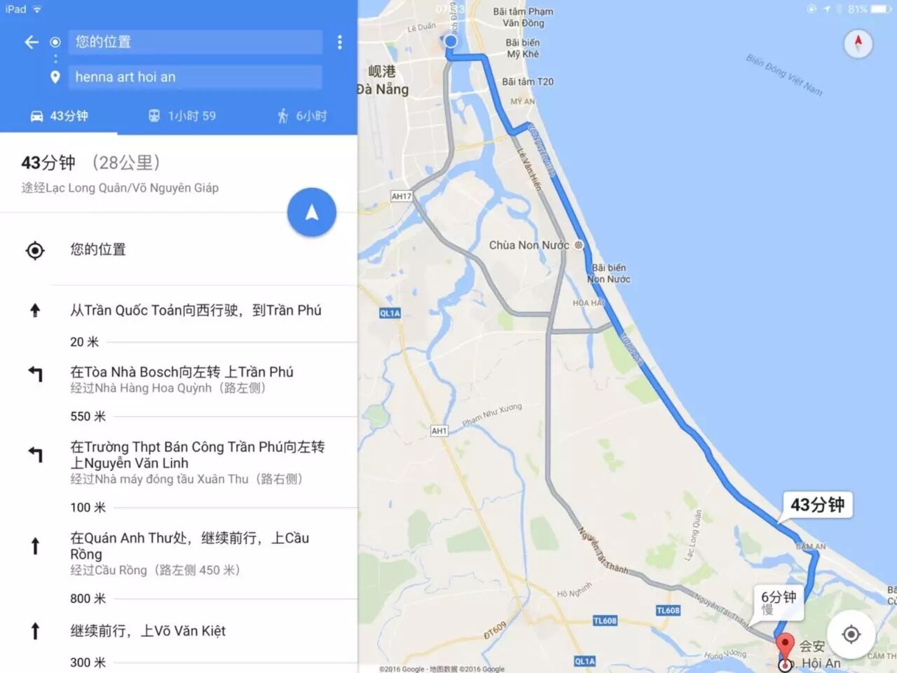另外这个地址是可以到会安古镇的,没有问题,只是这家“印度纹身”店已经不再存在。图中是骑车行驶的时间,摩托车的话大概要两倍的时间(如果顺利不像我迷路的话)。