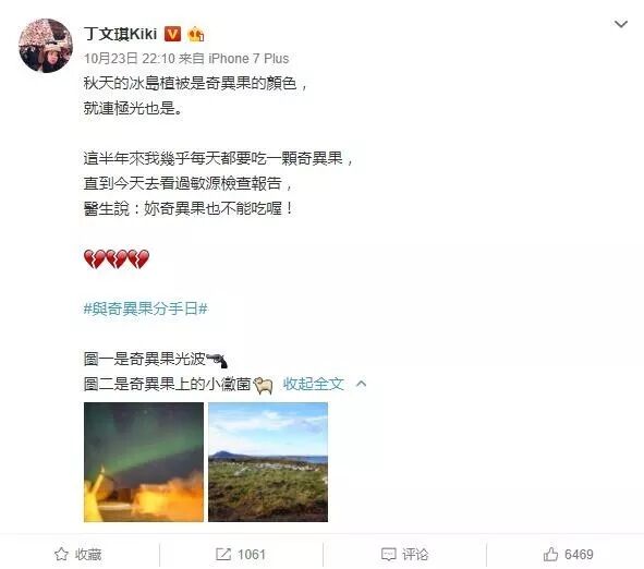 而昨天丁文琪在微博中晒出极光照,写道:“秋天的冰岛植被是奇异果的颜色,就连极光也是。”