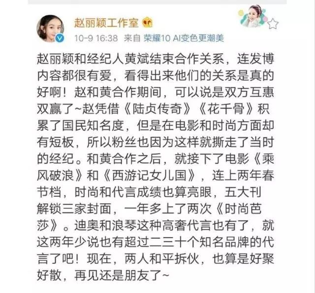 早在赵丽颖和黄斌分道扬镳时,转投新公司就势在必行。此前黄斌试图用大牌代言来打造她的转型路,显得急功近利,而且并不适合赵丽颖,以至于收效甚微,甚至引发一阵群嘲。