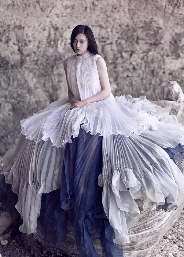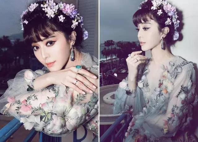 2015年范冰冰夏系列的水蓝色立体贴花纱裙,头戴花环,宛如“花仙子”般踏花而来的绝美照片,就是出自章元一之手。
