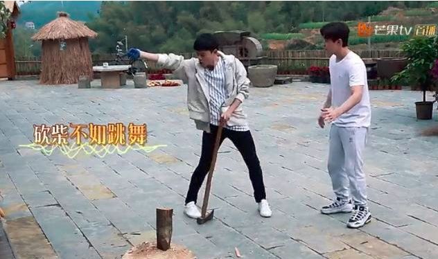 劈柴的时候刘宪华说要边跳舞边劈,然后张杰也学着来,一边跳MJ的舞一边劈柴。