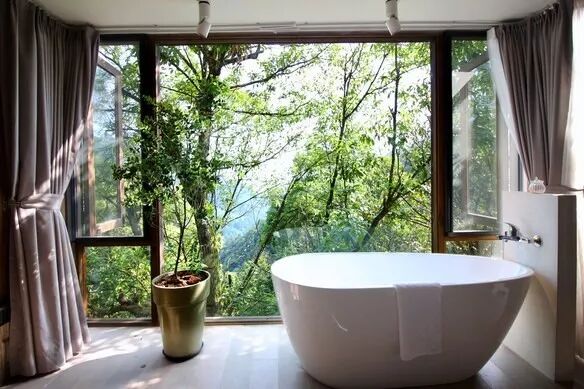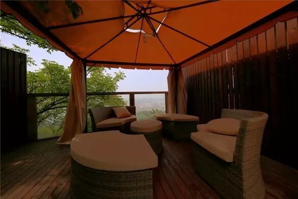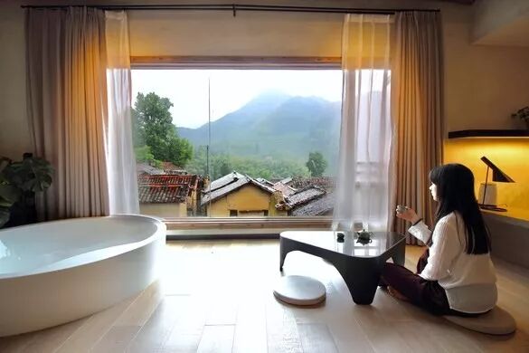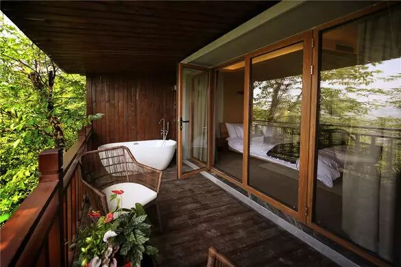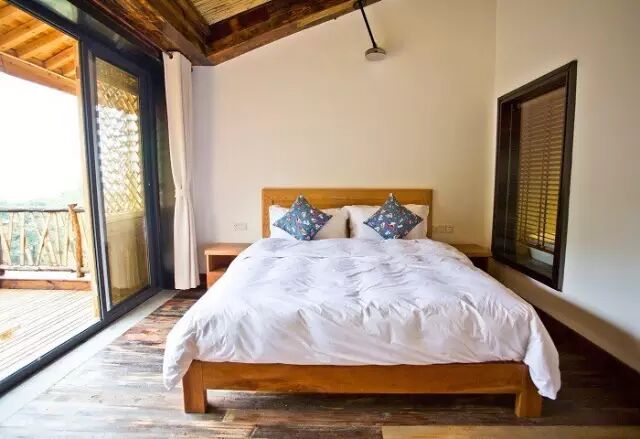 房间风格也很素雅,木质的地板围栏,阳台上的浴缸。推窗即是山野,傍晚可以看落日,晚上赏月赏星星。
