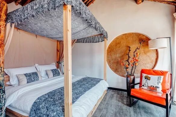 书舍有房间4间,原木牌坊、原木茶桌、原木床榻,所有的装饰均就地取材,青瓦白墙的乡间小屋,让你在此感受时光的静好,过一日诗意隐世的生活。