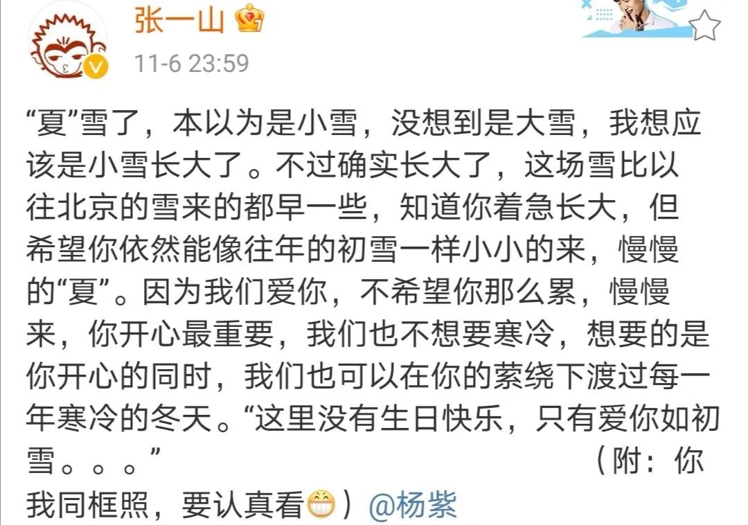 小作文里张一山借初雪为“夏雪”庆生,配图以灯光比“刘星”,寓意“夏雪和刘星在初雪之日一起陪伴”,好似张一山和杨紫的友谊长长久久。“爱你如爱初雪”希望杨紫可以不要那么累,要永远快快乐乐,可见非常之用心呐!