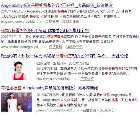 1980年的杨雪比杨颖大9岁,不少网友称她俩更像双胞胎姐妹。在网上看到一些言论,说Angelababy是照着杨雪来整的。不过后来发现,有的照片跟baby超级像,有的就不是很像,不过整体来讲还是很神似的。