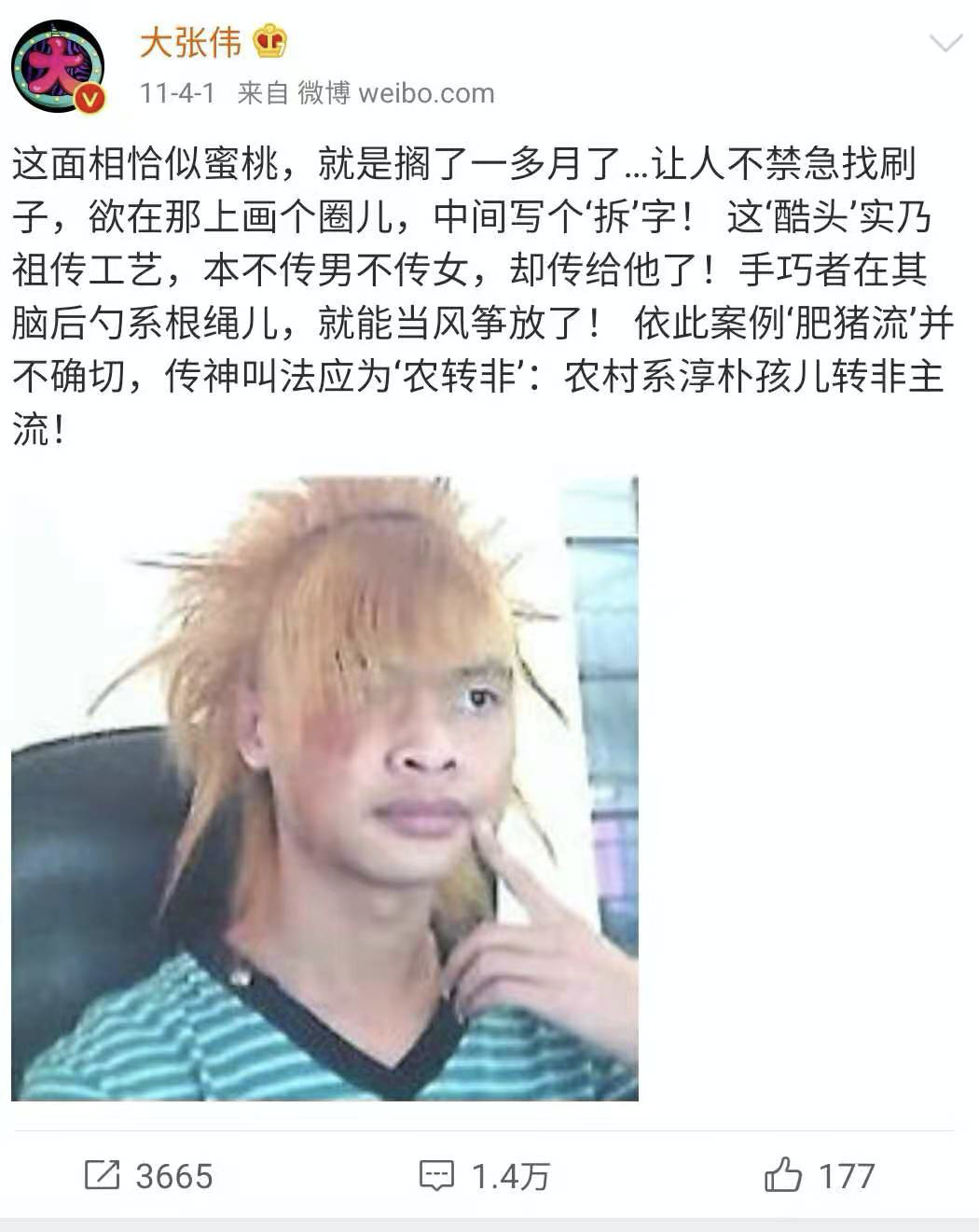 对不起,大张伟!你的微博,刺痛了1000万人的心 周冲的影像声色 内地男星 2020-12-12 20:36:07 274 创作不易,用心坚持,欢迎请BaGua喝几杯爱心咖啡!打赏并支持本文 打赏并删除本文 一个灵魂已经觉醒的人,你不会再嘲笑和伤害别人,因为你知道,其实别人只是附在另一躯体上的最敏感的你。——周国平看到杀马特的照片后,李一凡愣了好久。 一群来自乡镇的年轻人,调侃自己为“贵族”,还把外表折腾得特别丑。 贫穷、自黑,但很叛逆。 这是2012年,他觉得中国有朋克了。 李一凡,四川美院的教授、艺术家,同时也是一名纪录片导演。 当时他想做一个“自我定义”“审美自治”相关的艺术计划。 杀马特群体强势闯入他的视野。 在他敏锐的艺术嗅觉里,这群人高度契合主题—— 有审美自觉,并主动抵抗消费主义。 受不了了,李一凡决定要拍一部纪录片,记录这个“伟大”的群体。 但当时处于后杀马特时代,线上QQ群的审核非常严格,现实中的人又被打压得不敢冒头。 根本无法取得信任、建立连接。 李一凡非常气馁,只好将计划搁置。 直到2016年,他才在东莞,找到杀马特的“创始人”罗福兴。 不过还没进门,罗福兴就泼了冷水。 过去和舆论厮杀的经历,让杀马特们对主流媒体特别抗拒。 你一个中产阶级想要拍摄杀马特纪录片,能怀什么好心思? 不就是套我们资料,拍一部嘲笑杀马特的片子吗? 没办法,李一凡只好承诺让杀马特自述故事,不干预。 罗福兴和杀马特才卸下防备,袒露心扉。 这部纪录片叫《杀马特我爱你》。 78位杀马特的故事,拼接、还原了过去的杀马特时代。 而那些被历史忽略的真相,也逐渐再次显露…… 不是所有的非主流都叫杀马特。 事实上非主流有很多家族,杀马特只是其中一个分支,还有“葬爱”“残血”“视觉系”等。 只不过“杀马特”实在太夸张,火出圈了。 这些另类、怪诞的年轻人也就被外界统称为“杀马特”。 罗福兴出生在广东梅州,从小跟外婆长大。 有一天,他看到一张日本视觉系摇滚照片,瞬间被吸引。 那个人的头发鲜艳、蓬松,很夸张,也很时尚。 罗福兴买来了廉价的发胶、一次性喷雾染发剂,炮制同类型的发型。 然后将照片发到QQ空间,没想到火了—— 很多人开始模仿他。 他决定给这种风格起个名字。 然后在一片“时尚”的英文翻译中,选中了“smart”。 “smart”的中文发音是“斯马特”。 罗福兴觉得气势不够,就改为“杀马特”。 追随、模仿的人越来越多,他就以“杀马特”之名,建QQ群。 群分为两种,审核群和正式群。 审核的人会进入QQ空间,根据发型、审美综合考虑,才能加入杀马特正式群。 风光的时候,罗福兴手上掌管几十个群,每个群有上千人。 这些群秩序井然,有明显的等级制度。 相同的追求和抱团取暖让他们心生“共同体”之感,引发对“家族”的骄傲。 在这个虚拟王国里,罗福兴享受着权力的快感。 他们自称“贵族”,时不时聚集街头。 什么都不干,只是聚集闲聊。 对于他们而言,出门就是降维打击,就是让贵族气质熏陶百姓,提高“凡人”的审美。 这种行为被他们称为“炸街”。 有人围观? 越多越好! 越多人看,越开心。 就算是被嘲笑,也不要紧。 心中的信念让他们扬起高傲的头颅。 纵然外界狂风暴雨,老子品味天下第一。 2010年,杀马特的发展达到顶峰。 一声令下,同县市的成员纷纷响应。 五颜六色的光从城市的各个角落射出,汇聚成汹涌的光柱。 他们的虚荣心得到空前的满足。 相对的,也变得狂妄自大。 他们在网上到处发帖,扩张家族。 即使来到最大的“李毅吧”,也狠狠跺两脚,留下印记。 终于有一天,吧友们爆发了。 他们发起“为杀马特收集10000句‘杀马特滚出中国’”活动。 网络上掀起了轰轰烈烈的反杀马特浪潮。 在刀光剑影中,嘲笑杀马特成为政治正确。 “脑残”“傻X”等羞辱性词语层出不穷地附加在他们身上。 杀马特也奋起反击,家族的尊严神圣不可侵犯。 舆论浩荡,尸横遍野。 这件闹剧甚至还牵扯上了一位明星。 那时大张伟单飞不久,多项丑闻缠身,事业极其低迷。 属于“破罐子破摔”阶段。 自从“杀马特”诞生以来,大张伟由于夸张的造型一直被嘲讽为杀马特。 实际上,他是真正的朋克青年,与杀马特没半毛钱关系。 愚人节那天,他发了一条带有歧视性色彩的微博自嘲。 没想到玩过火了,引发杀马特的集体不满。 他们纷纷来到大张伟的微博下,逼他道歉。 大张伟也是有粉丝的啊。 双方开始互相撕扯,好不热闹。 两个被众矢之的的群体互撕,网友们当然也喜闻乐见。 对于杀马特的讨伐,并不止于网络骂战。 有人成立专门反杀马特的组织,暴打他们。 最初做这件事的是“ACB家族”。 它由四个年轻人创立——韩雅龙、韩雅轩、韩雅熙、韩雅冰。 主要任务是守在带有“潮流”字样的发廊门口。 两位男生负责把独行的杀马特打一顿,一位女生负责烧头发,一位负责拍照。 他们将这些照片发布到网上,以此羞辱杀马特。 有人开头后,无数人跟风,对杀马特施以“正义”的铁拳。 2013年,《杀马特遇见洗剪吹》等网络歌曲走红。 现实中,男杀开始被嘲“洗剪吹”,女杀被笑“焗染烫”。 引以为傲的精神寄托遭到侮辱,信念一步步被瓦解。 杀马特堕入深渊。 更可怕的是,还出现了针对杀马特的犯罪团伙。 有报道称,一些人专抢杀马特,原因是看不惯。 而在这些新闻下,往往附有掌声,大有“