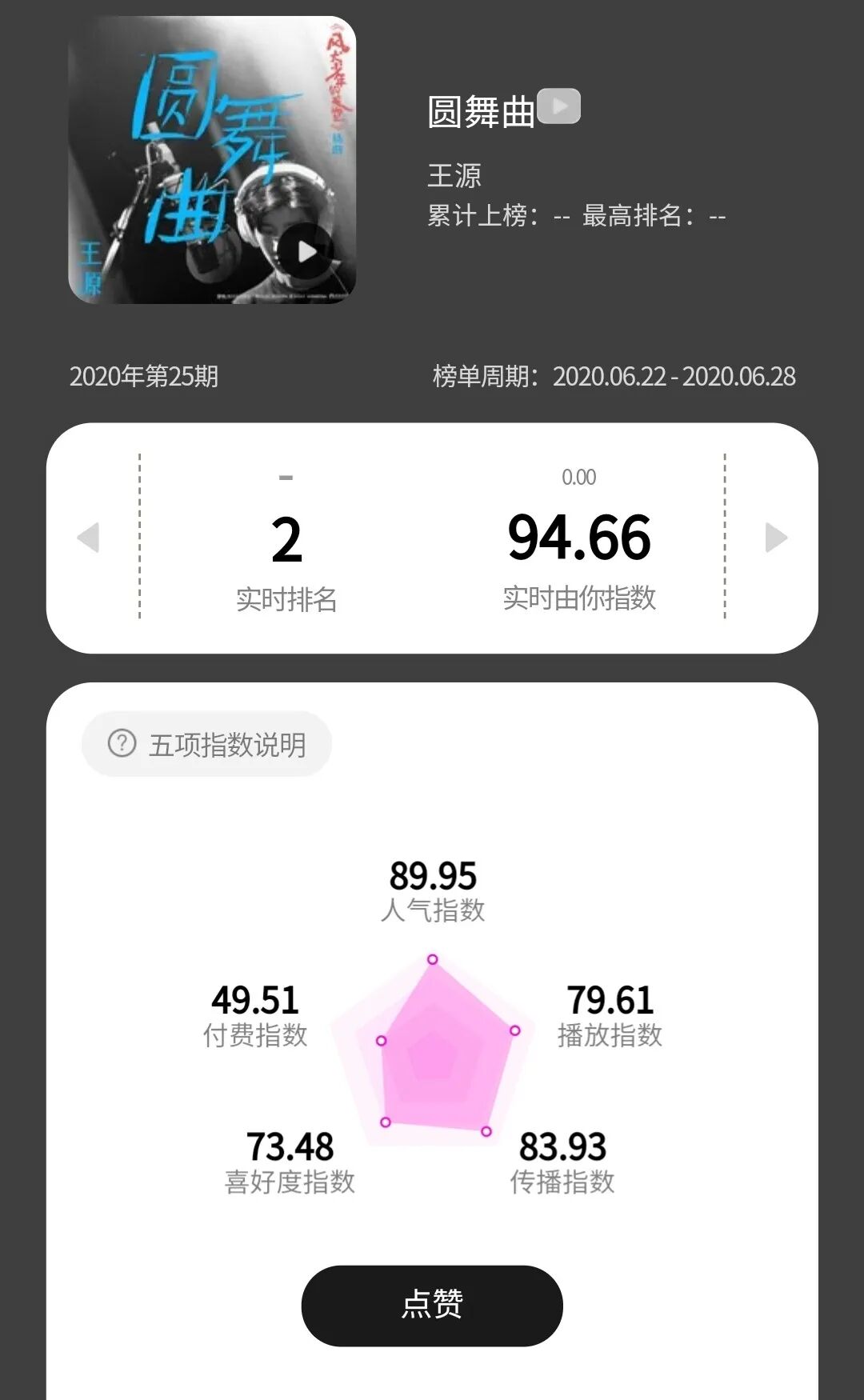 《圆舞曲》6月23日周二上线,上线第二天就飙升至TOP2,并保持到本周日结束。