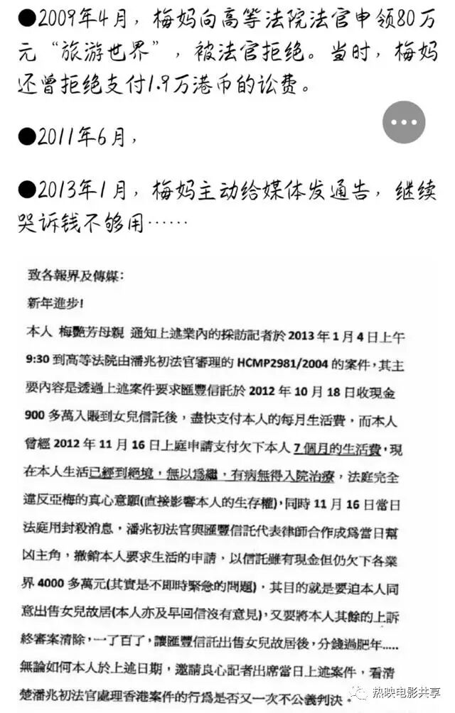 但是,梅妈妈并不满足仅仅7万元的钱财,从2003年梅艳芳逝世至今,她年年和法院打官司,意图接收梅艳芳的全部财产,在不断哭穷的情况下,梅妈妈的每月花销后来提升到了12万元。