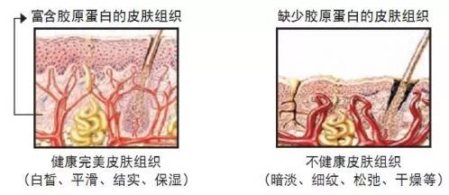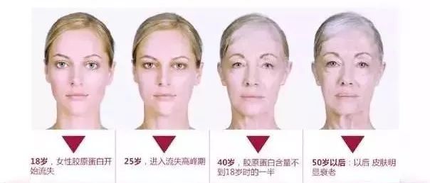 A:在人体皮肤中,75%的真皮层由胶原蛋白组成,其中80%为Ⅰ型胶原蛋白。人体在年轻时能够制造许多胶原蛋白,但它们的产量会随着年龄增长而减少。女性因生理期、生育等原因,胶原蛋白流失的速度是男性的2.5倍。胶原蛋白的流失,反映在皮肤上,就是衰老的征兆:肌肤干燥、粗糙、缺乏弹性和光泽;出现法令纹、鱼尾纹,皱纹变多变深;皮肤受重力作用松弛下垂,脸部轮廓走样。